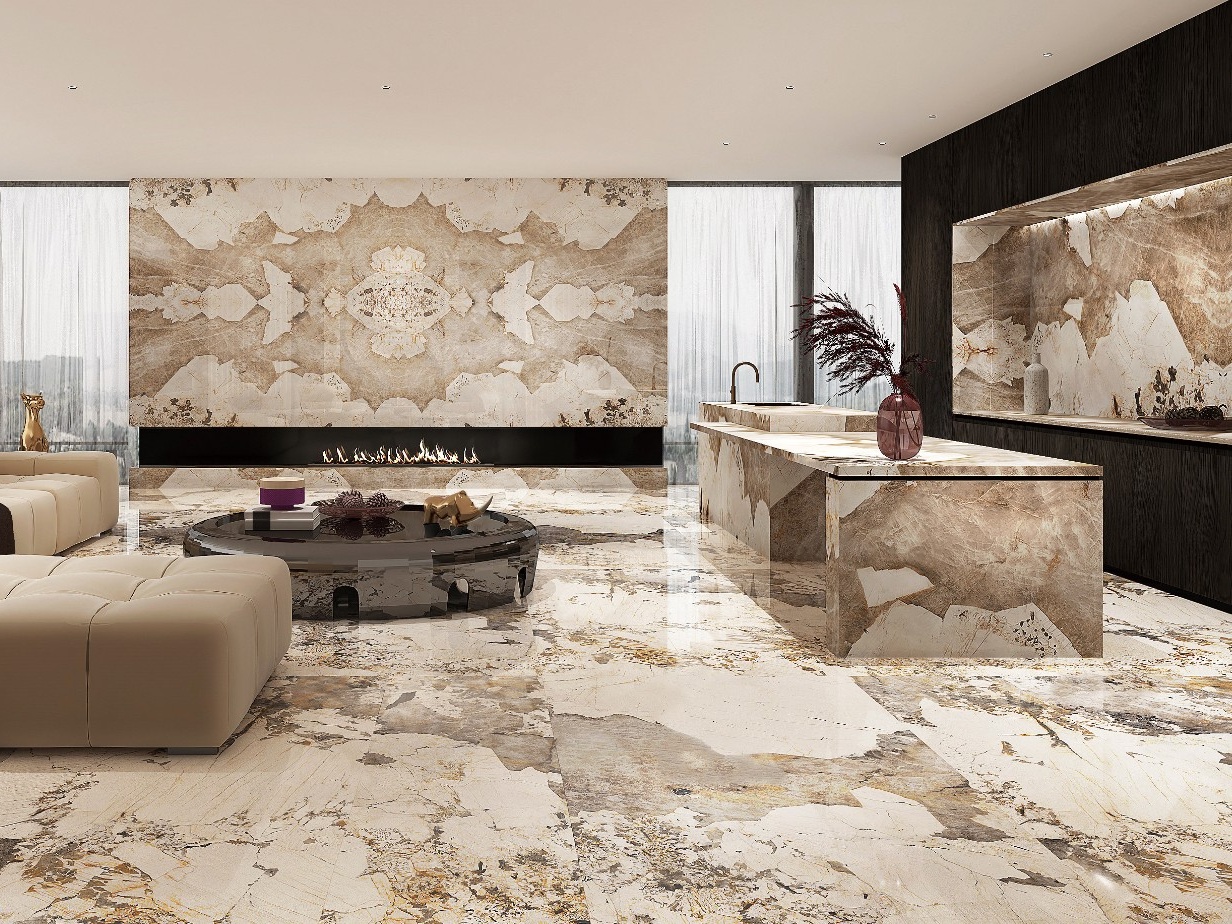 Patagonia SM-813 is a Beige and Cream Porcelain stone with Brown and Grey veins, polished texture, with bookmatching capabilities, and located in 126 Peelar Rd, Vaughan, ON L4K 2C9, Canada. Posted by Sinterstone.
